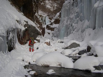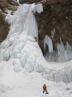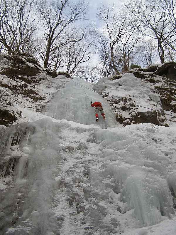 その後友知らず右岸の20m程の氷瀑に移動、Y田リードでトップロープをセットし