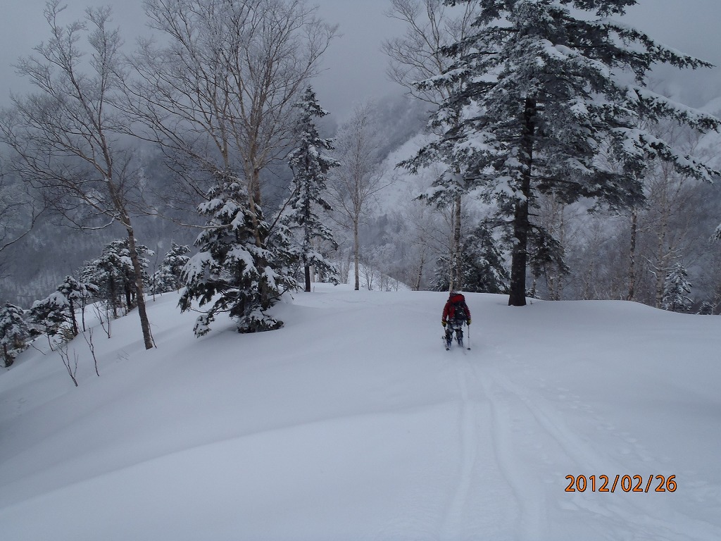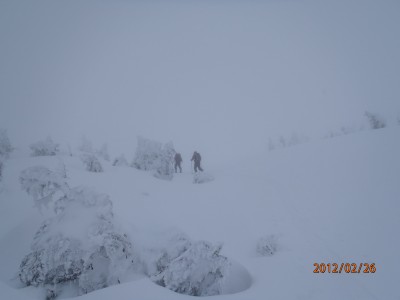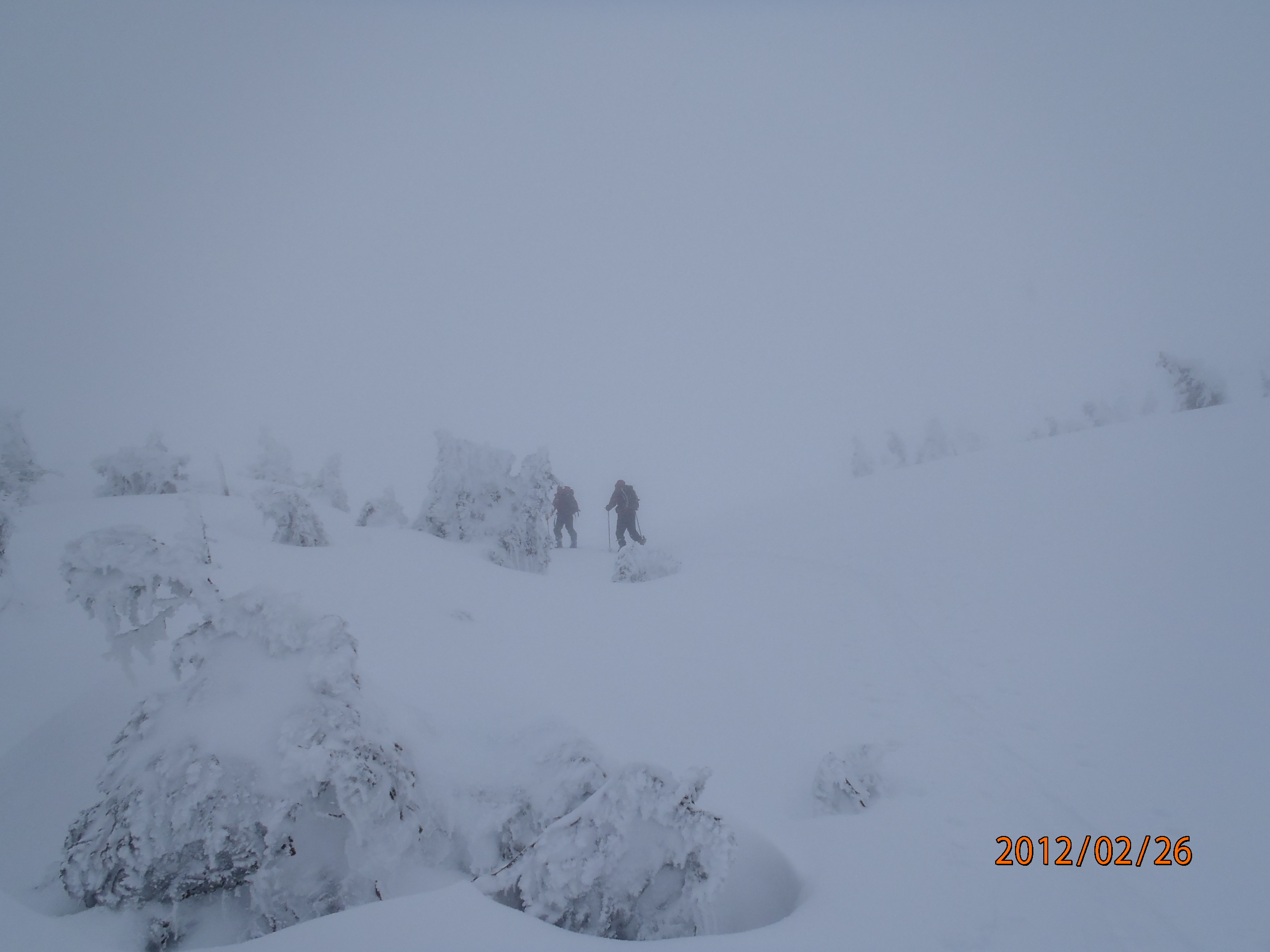 Y田、S井、他2。曇りのち雪。06:00久手牧場~12:05猫岳北方コル2500m地点~14:05久手牧場。