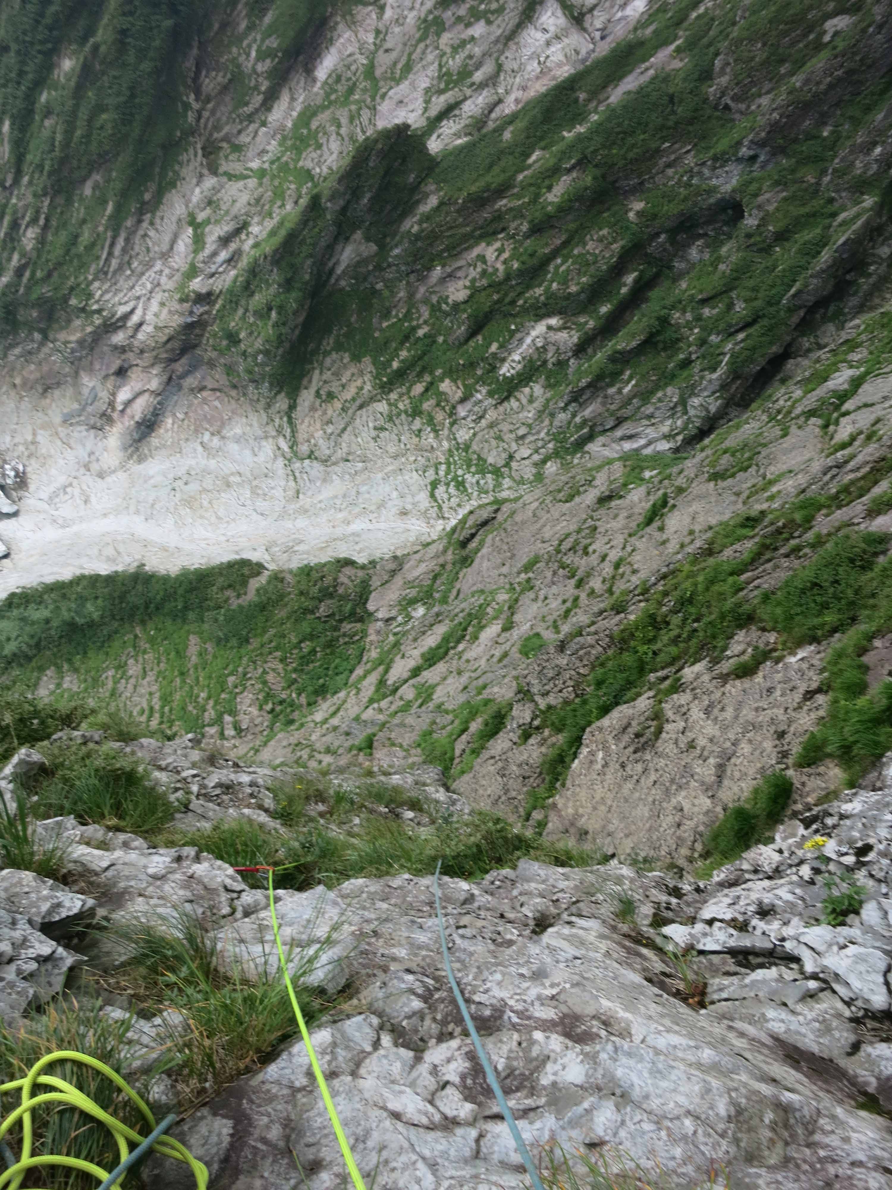 芯もほつれてばらけている)を使ってルンゼへ下降。ロープに繋がる残置カラビナ