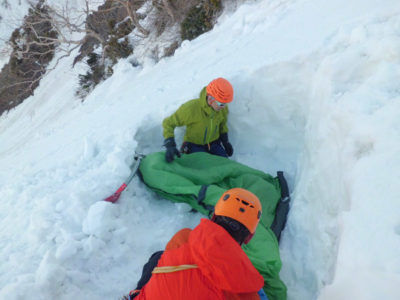 ところが斜面上なので適地がなく、Y本さんとU島さんが斜面を掘りまくって整地。風が強くてテントが飛んで行ってしまいそうなので、I塚はテント内に入って重しに。そんなこんなで整地に1時間以上かかってしまいました。しかもビバーク地は70度近い斜度があり、滑落したら白馬尻まで落ちてしまうので、夜トイレに行くのも決死の覚悟・・・