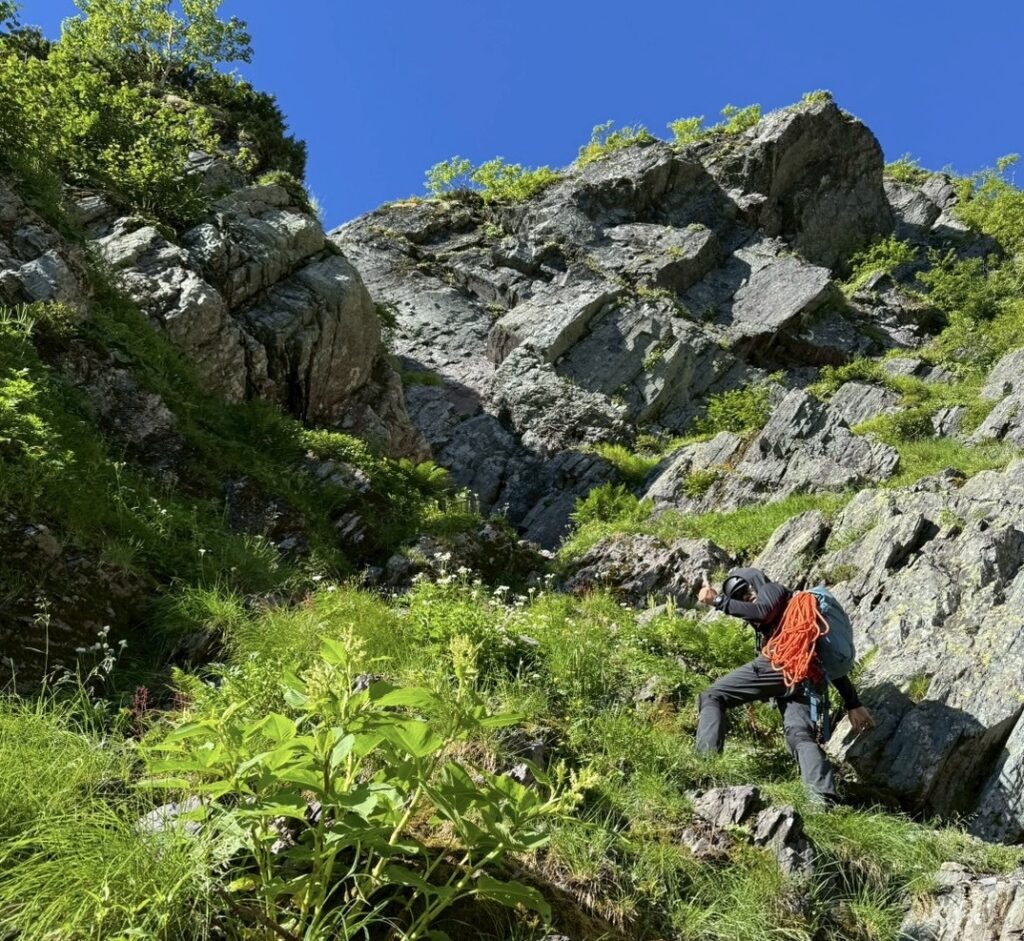 大滝を登り終え、直上するか左の草付きの踏み跡を行くか迷って左の草付きを巻いたけど、結局同じところに繋がっていた。