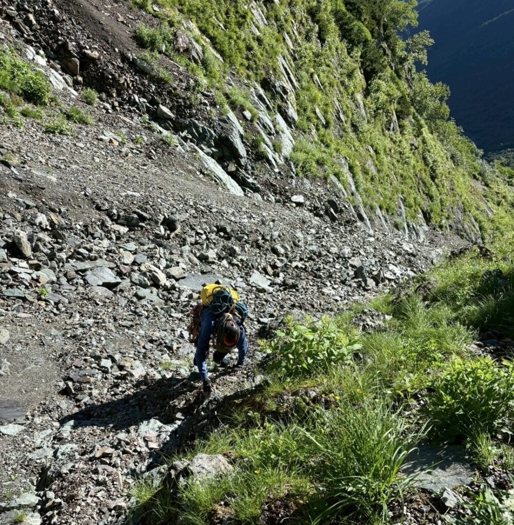 Cガリーはガレガレでかなり不安定。慎重に登りつめて対岸上部のヒドンスラブの取付きに到着。