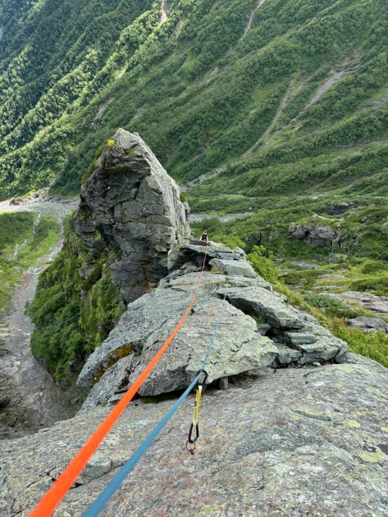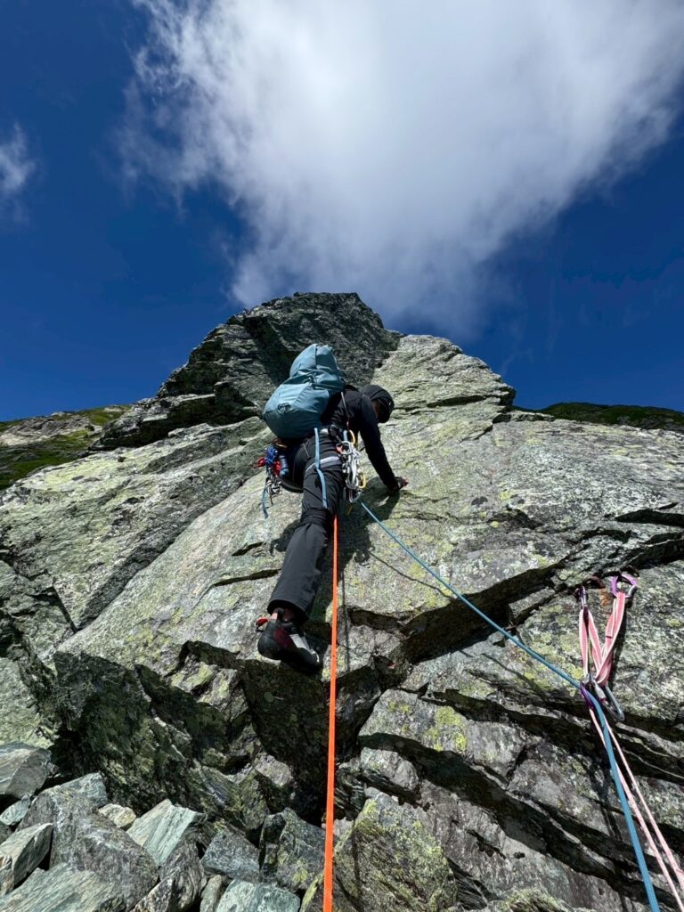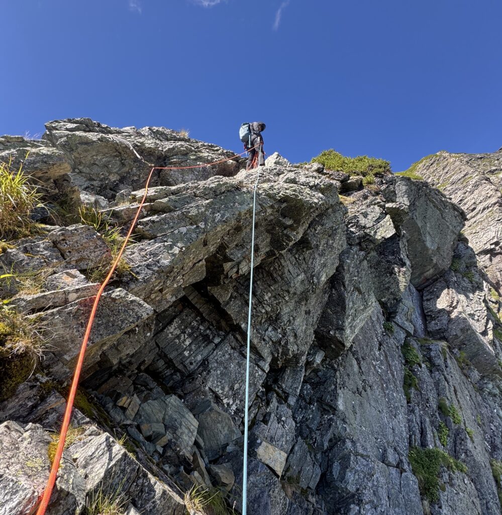 3、4ピッチ目のリッジをフォローで登る。緩傾斜なのだが高度感がハンパなくビビる。