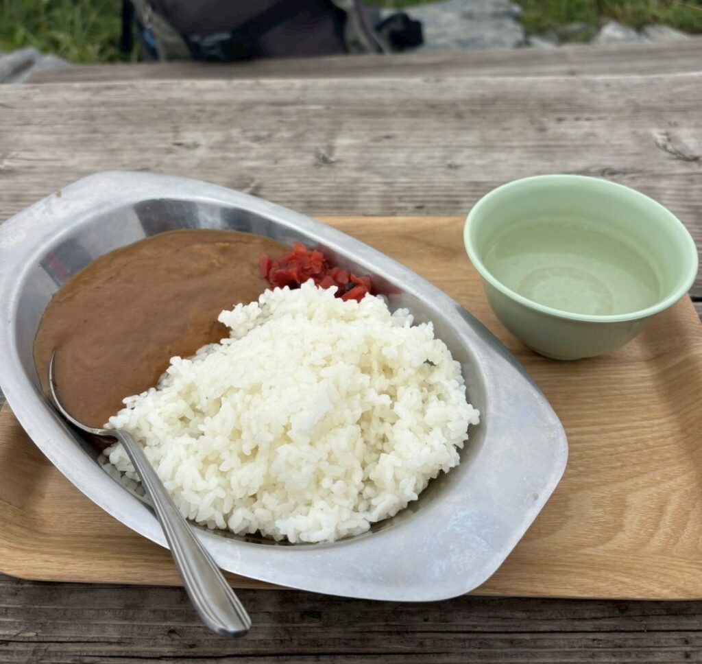 肩の小屋まで降り、他の登山者がカレーを美味しそうに食べているのを見て食べずにはいられなくなり注文する。